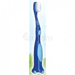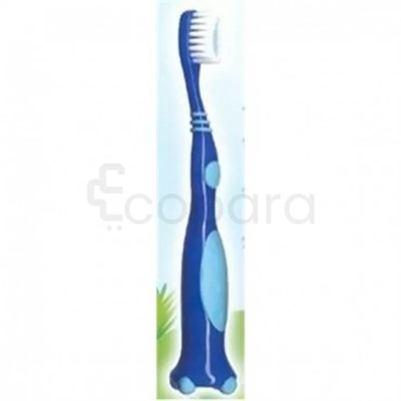 Petite tête incurvée et ovale munie de brins extrasouples et bicolores, Manche ergonomique, antidérapant, muni de petits pieds pour un maintien en position debout.